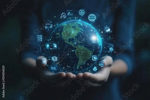 A person holds a glowing globe with digital icons representing global connectivity and data.