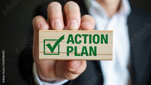 A person holds an action plan wooden block, showcasing strategy for business management and achievement towards goals, pointing to a clear roadmap for success, project execution.