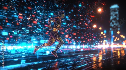 A person hurries through a futuristic digital corridor at night, surrounded by vibrant data streams and radiant glowing effects