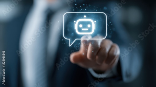 A person in a formal suit engages with a virtual assistant interface, showcasing the integration of chatbot technology in a workplace setting for improved communication