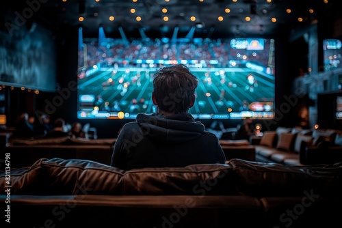 A person in a hoodie is immersed in watching a live sports game on a large screen in a dark room