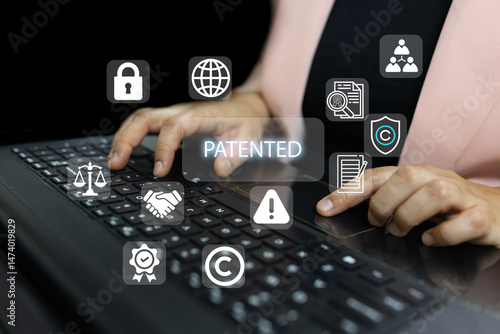 A person in a pink jacket touches a floating digital interface with "PATENTED" at the center surrounded by icons for security, copyright, law, and documents, symbolizing IP and legal protection.