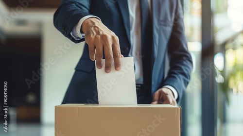 A person in a suit placing a ballot paper into a voting box. The image emphasizes the act of voting, democracy, and civic participation.