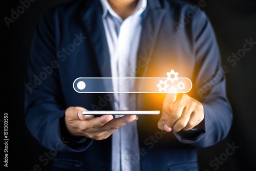 A person in a suit uses a tablet, interacting with a glowing digital search bar and settings icons.
