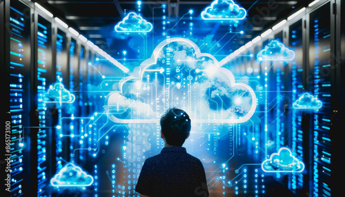 A person interacting with a digital cloud interface, symbol icon computing and technology.