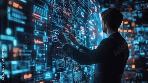 A person interacting with a digital interface displaying data and analytics.