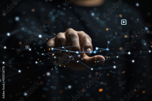 A person interacting with a digital interface featuring glowing connections and icons in a dark setting at night