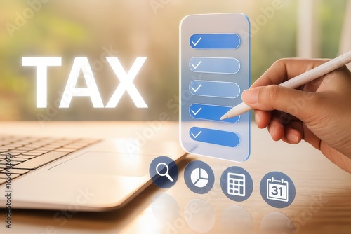 A person interacts with a digital checklist interface, superimposed over a laptop, displaying the word "TAX" in a prominent way.