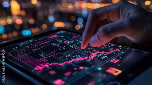 A person interacts with a digital tablet displaying colorful financial graphs and data, illuminated by city lights in the background.