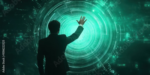 A person interacts with a futuristic interface, representing technology, innovation, and digital exploration in a vibrant green setting.