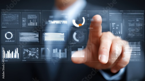A person interacts with a futuristic transparent digital interface displaying various charts, graphs, and data analytics.