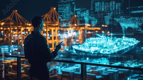 A person interacts with a virtual interface displaying shipping data against a backdrop of a busy port at night.