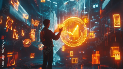 A person interacts with glowing digital graphics, displaying data and analytics in a futuristic, tech-driven environment.