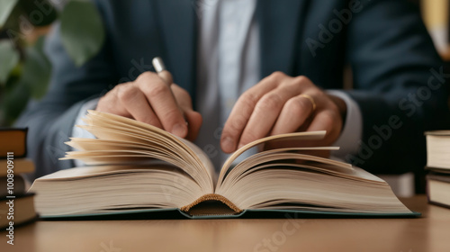A person is engaged in writing notes in an open book, surrounded by stacks of books. scene conveys sense of focus and intellectual pursuit