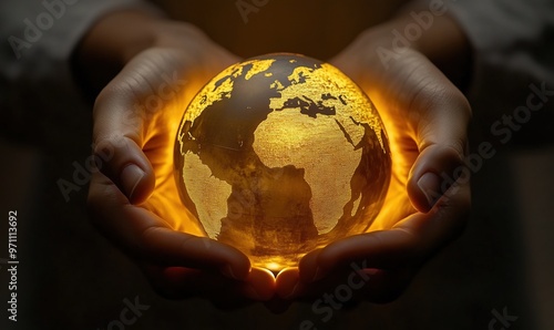 A person is holding a globe in their hands. The globe is lit up, giving it a warm and inviting glow. Concept of wonder and curiosity about the world, as well as a desire to explore