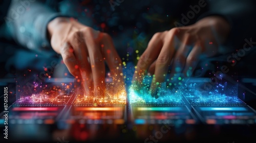A person is playing a video game with their hands on a colorful keyboard
