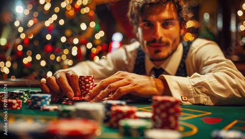A person is playingin casino, with their hands holding chips on the table in front of them. The background is blurred