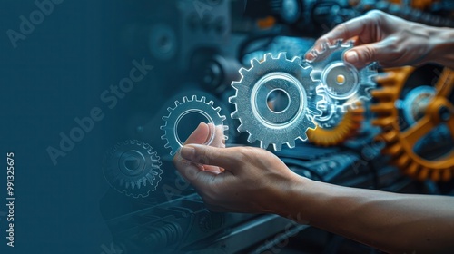 A person is pointing at a blue image of gears, Businessman holding floating digital gears, symbolizing technology and innovation.