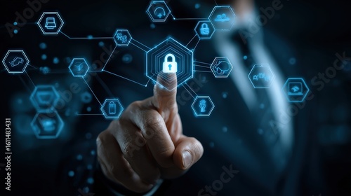 A person is pressing a digital lock icon on a futuristic interface, symbolizing cybersecurity and data protection.