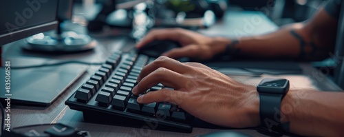 A person is typing on a keyboard with their hands. Concept of productivity and focus, as the person is likely working on a task or project