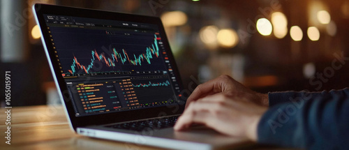 A person is using a laptop to analyze stock market data. The laptop screen shows a graph of stock prices and the person is typing on the keyboard. Scene is focused and serious