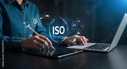 A person is working on iso standards using a laptop and tablet, ensuring quality management and compliance with international regulations