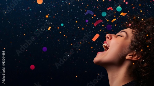 A person laughing loudly, head thrown back, with multiple joy symbols and sparkles floating around them