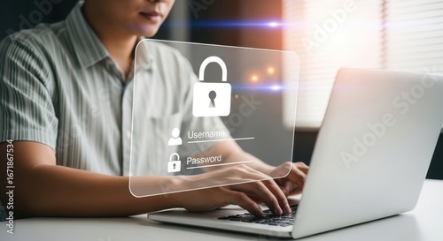 A person logs into a secure system on a laptop, with a holographic padlock and login fields displayed