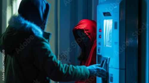 A person looking anxious as they withdraw money from an ATM with a suspicious figure lurking behind