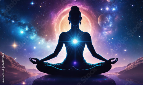 A person meditates in a lotus pose, bathed in the glow of a starry night sky
