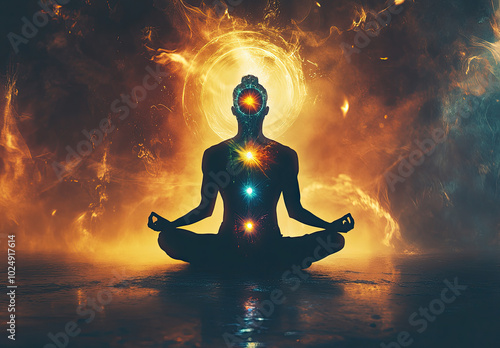 A person meditating with their aura glowing around them, symbolizing the connection between mind and body in a healing meditation