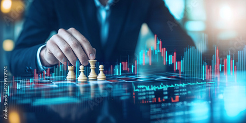 A person moves chess pieces over a digital financial chart, symbolizing strategy and decision-making in investment and trading..