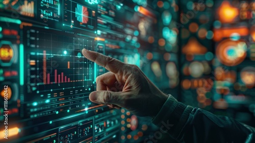A person pointing at financial charts on a calendar with digital overlays in an office. The scene is organized and detailed, emphasizing financial planning and technology.