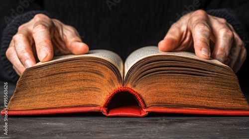 A person reading a motivational book with focus and intention symbolizing learning and self-improvement through reading and reflection Large space for text in center Stock Photo with copy space