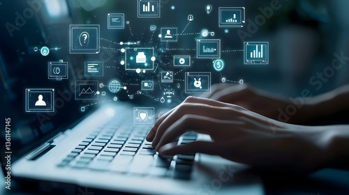 A person s hands are shown typing on a laptop keyboard with floating digital icons representing various and analytics tools