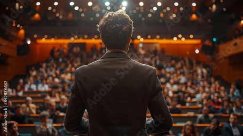 A person seen from behind addressing a large audience in a well-lit conference hall