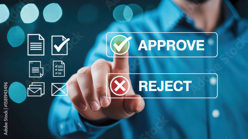 A person selecting approve on a digital interface with document icons and bokeh background effect