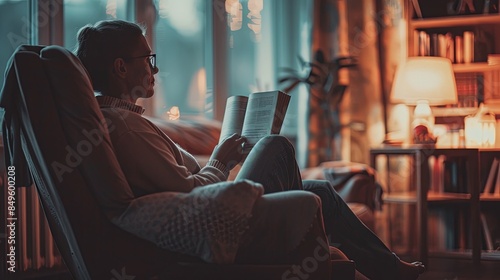 A person sits in a chair, holding a book, lost in thought, staring into space. Soft lighting enhances their detachment in the cozy room. Generative AI