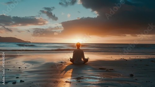 A person sits in a meditative pose on a tranquil beach during sunrise, surrounded by calm waves and vibrant skies, embracing peace and reflection..