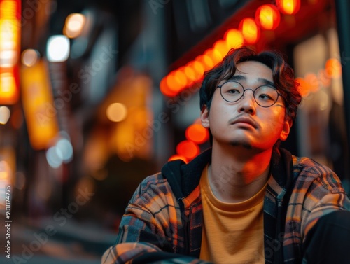 A person sitting on a city street at night lost in thought capturing a moment of deep reflection