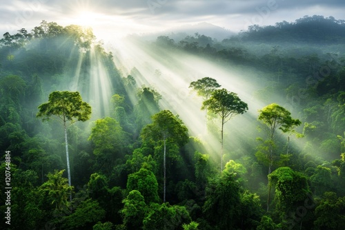 A person soaring over a rainforest canopy, their silhouette framed by beams of sunlight filtering through the trees