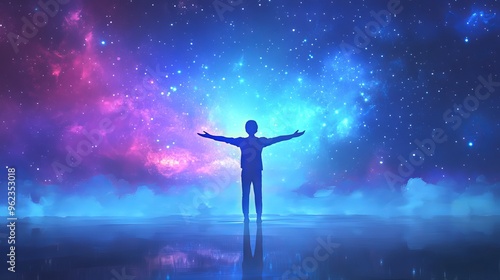 a person standing with open arms facing a starry sky, symbolizing emotional openness, self-reflection, and peace