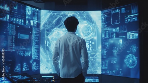 A person stands before a futuristic display of digital interfaces and data visualizations.