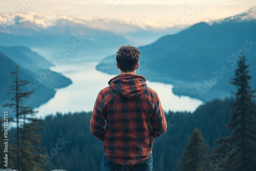 A person stands facing a vast mountain landscape with a serene lake in the distance, embracing the tranquility and majesty of the natural world from the viewpoint.