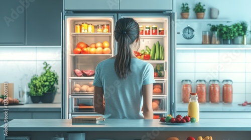 A person stands in front of an open refrigerator filled with fresh fruits and vegetables, contemplating meal options in a modern kitchen.