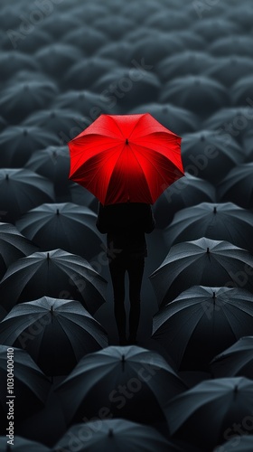 A person stands in the middle of a row of umbrellas, holding a red umbrella. The scene is a black and white photo of a rainy day