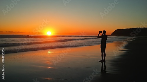 A person taking a photo of a sunset at the beach, capturing a travel memory