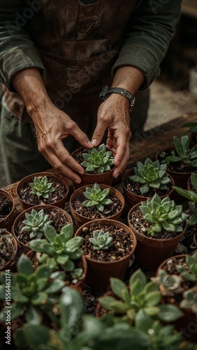A person tending to small succulent plants in terracotta pots on a wooden surface in a greenhouse