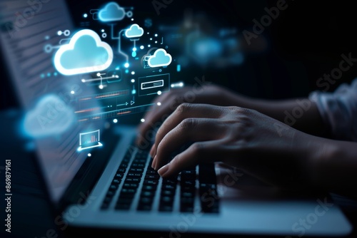 A person typing on a laptop with Cloud computing technology and online data storage for business network concept. Computer connects to internet server service for cloud data transfer