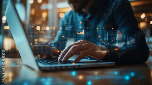 A person typing on a laptop with overlaid digital graphs, suggesting data analysis or financial technology in a modern environment.